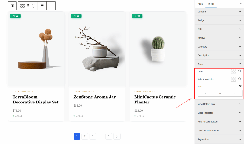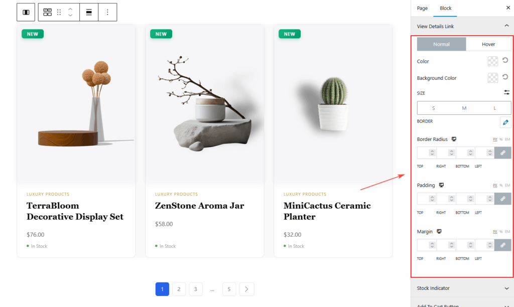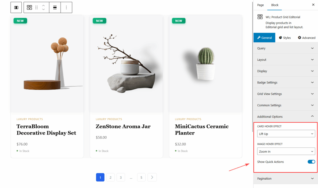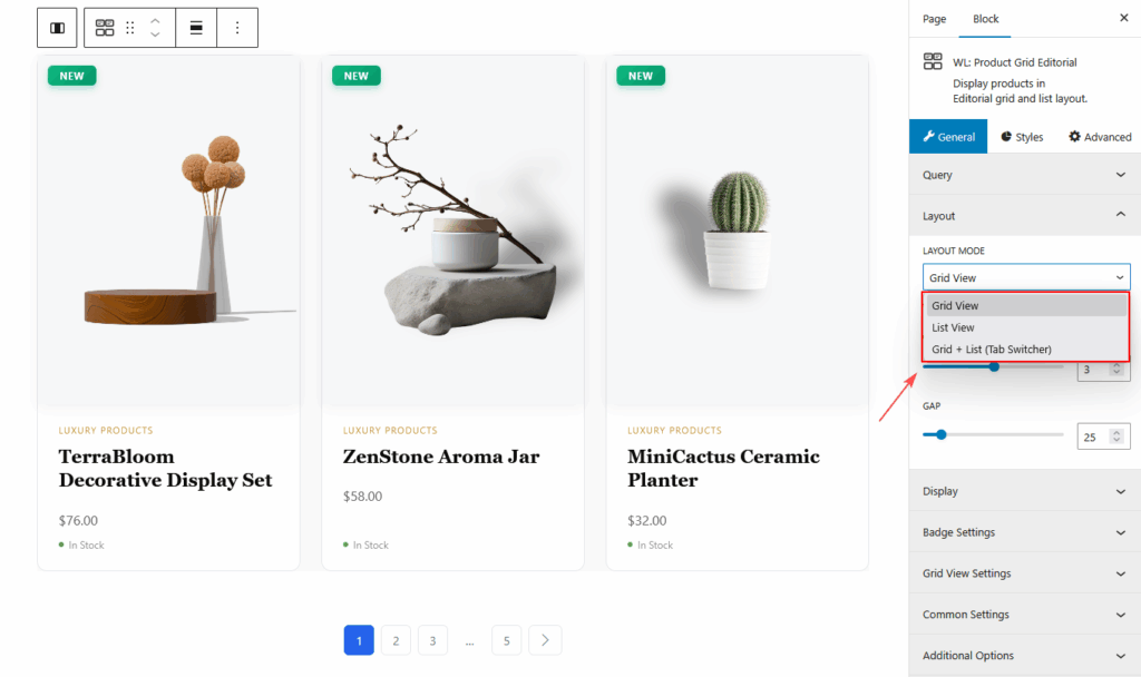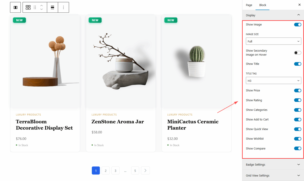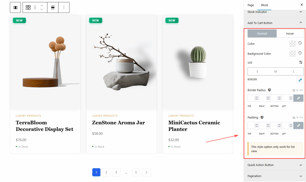 This block supports Grid View, List View, and a Grid–List Toggle, enabling customers to effortlessly switch between gallery-style browsing and detailed product views. With key editorial features like the View Details overlay button, animated stock indicators, smart badges, quick action buttons, editorial-style descriptions, and flexible pagination options, you can fully customize your store’s look and feel without needing Elementor.