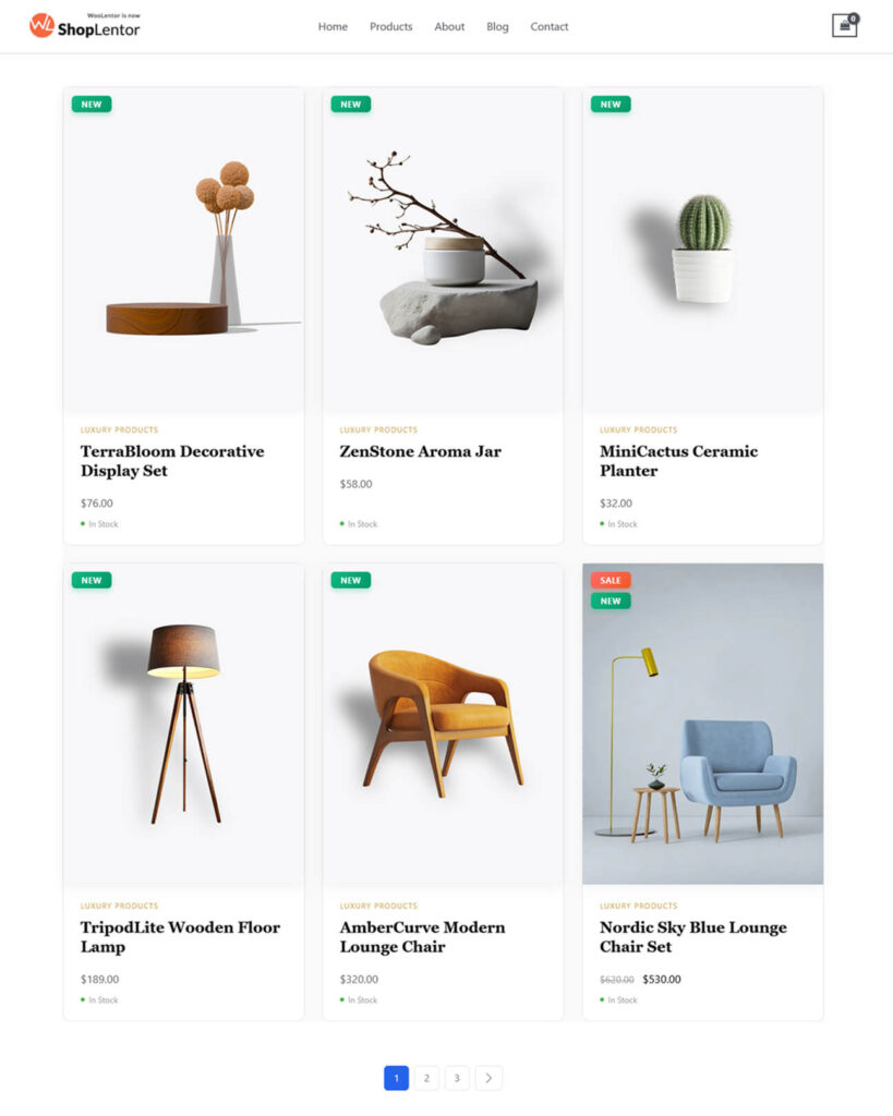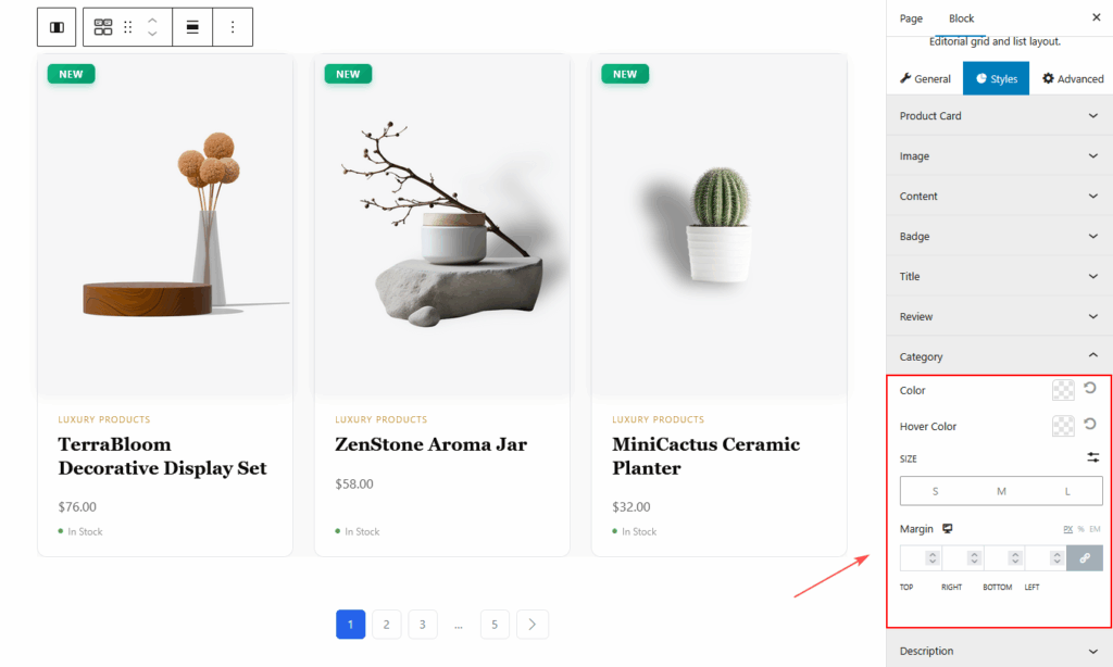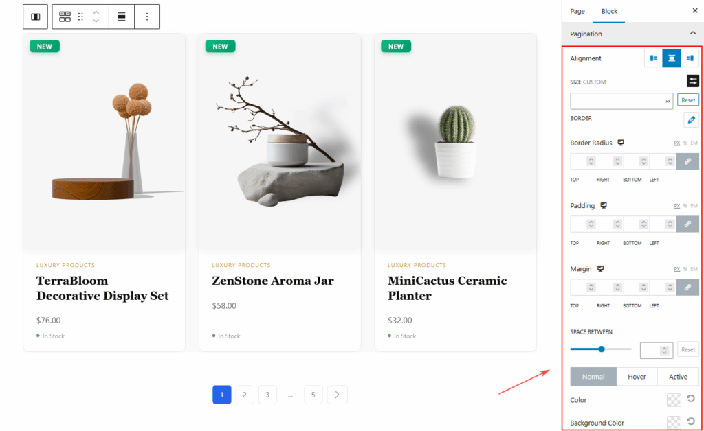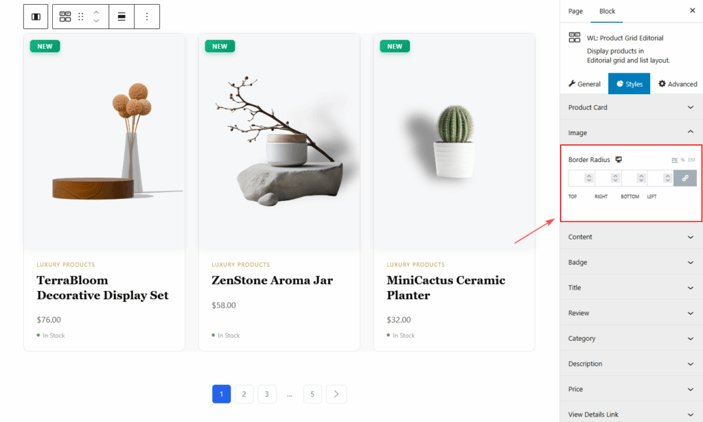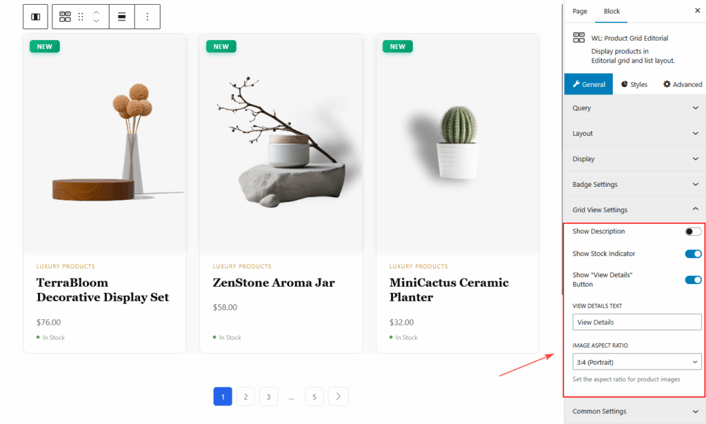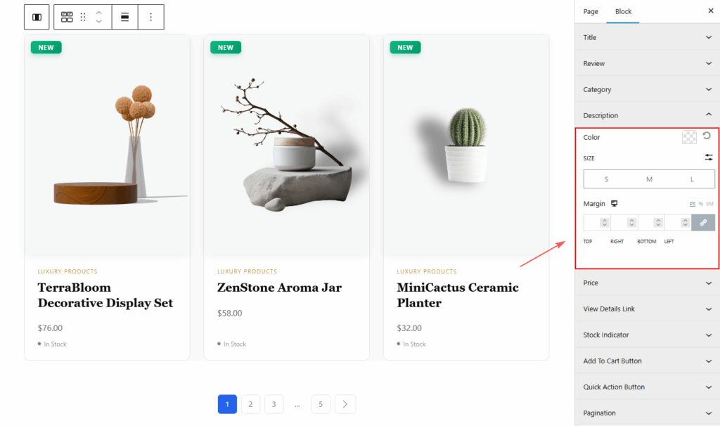 This block supports Grid View, List View, and a Grid–List Toggle, enabling customers to effortlessly switch between gallery-style browsing and detailed product views. With key editorial features like the View Details overlay button, animated stock indicators, smart badges, quick action buttons, editorial-style descriptions, and flexible pagination options, you can fully customize your store’s look and feel without needing Elementor.