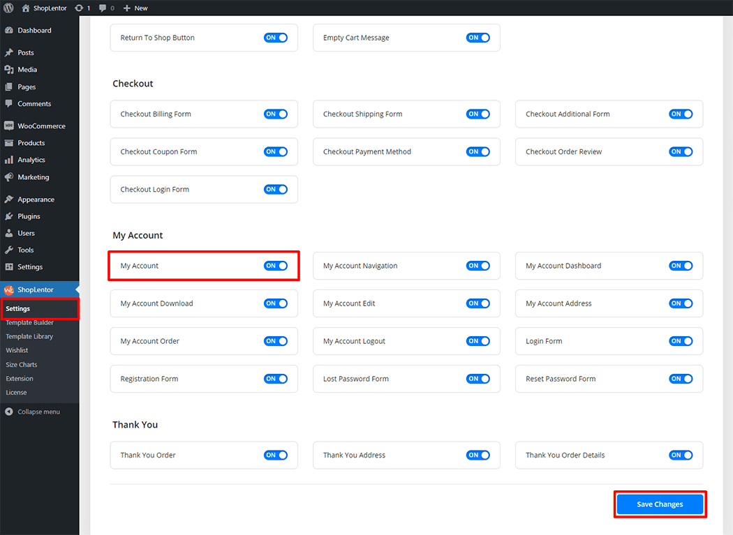 Go to WordPress Dashboard > WooLentor > Settings > Gutenberg. From the list of Gutenberg, turn ON the “My Account” Block.