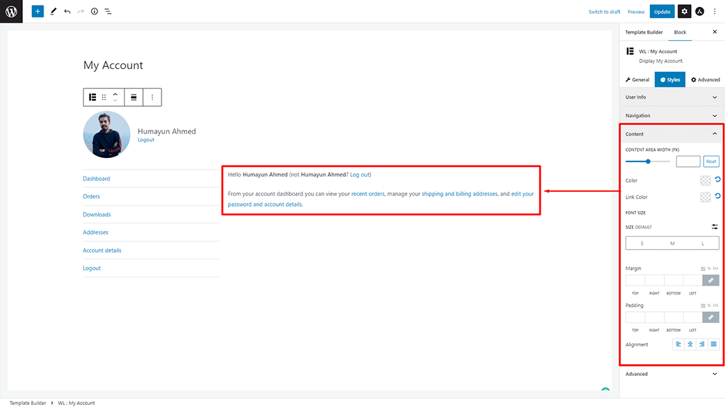 Content: You can change the Content Area Width, Color, Link Color, Size, Margin, Padding, and Alignment Style of My Account as needed.