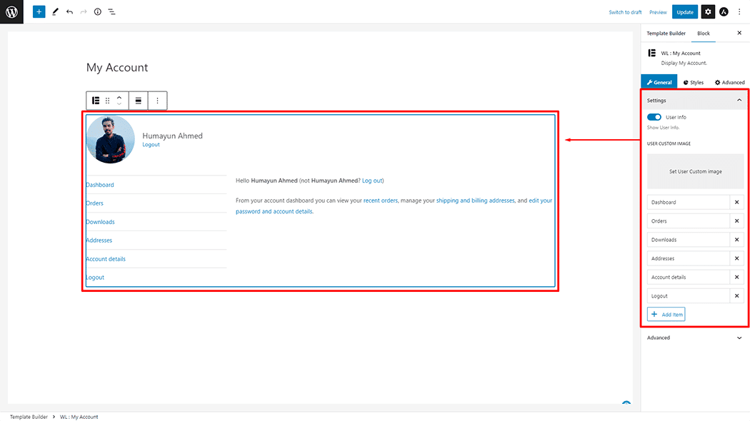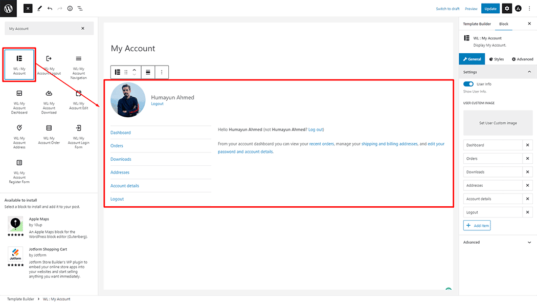 Drag and drop the WooLentor “My Account” Block onto the My Account Template.