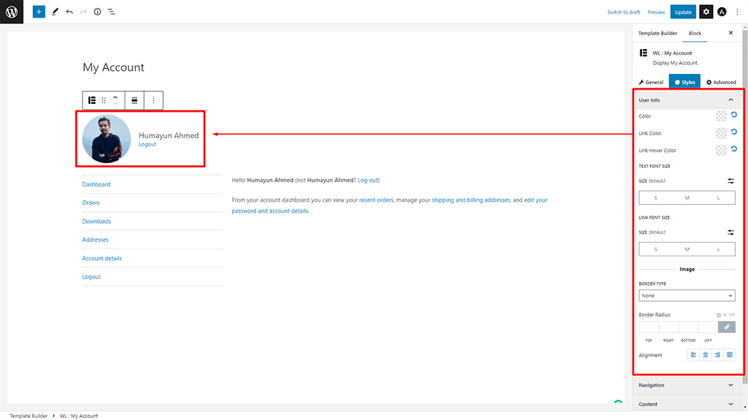 User Info: You can change the Color, Link Color, Link Hover Color, Text font Size, Border Type, Border Radius, and Alignment style My Account as needed.
