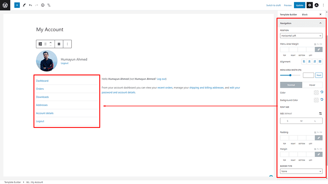 Navigation: You can change the Position, Menu Area Margin, Alignment, Menu Area Width, Color, Background Color, Size, Padding, Margin, and Border Type Style My Account as needed.