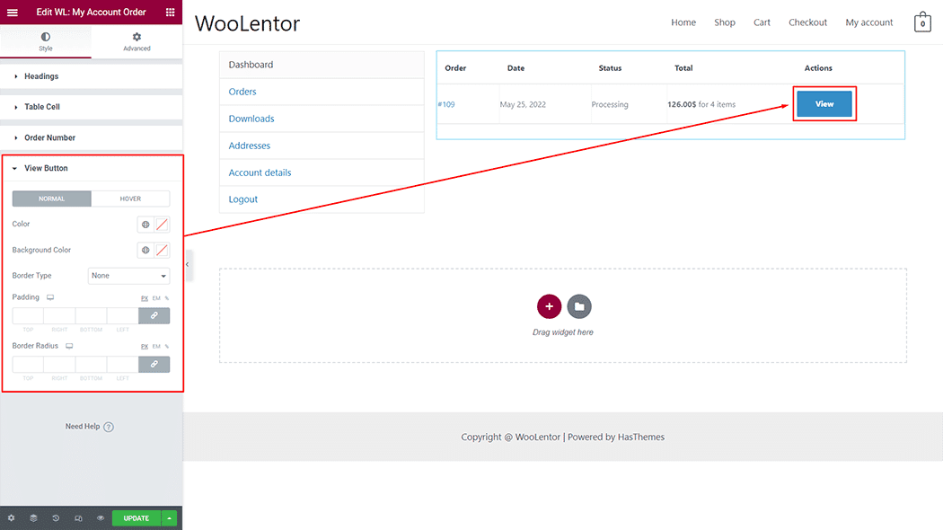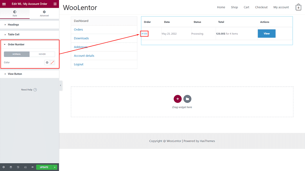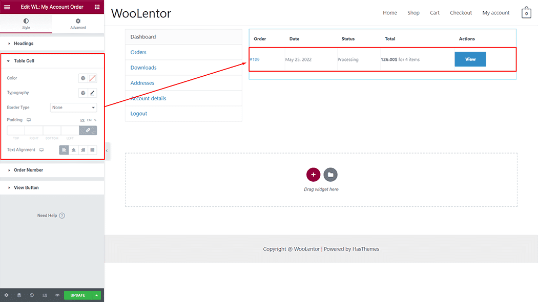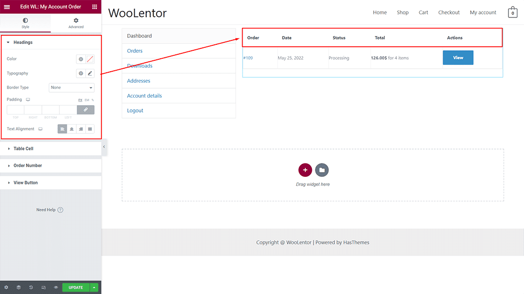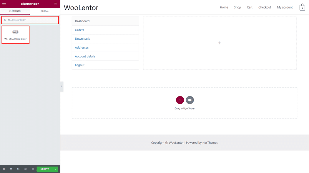 Drag and drop the WooLentor My Account Order widget into the My Account page template.