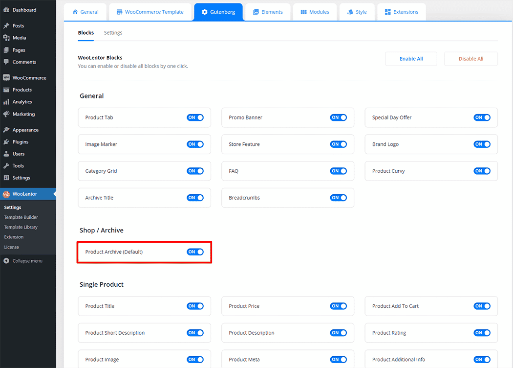 Go to WordPress Dashboard > WooLentor > Settings > Gutenberg. From the list of Elements, turn ON the “Product Archive Layout” Block.