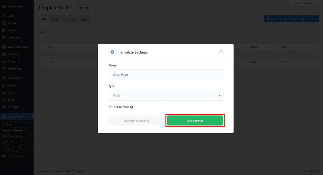 First, set the name of your Template and select it in the popup box for template settings. Select â€œShop” from the dropdown type list. check the Set Default and save the settings by clicking the Save Settings button.