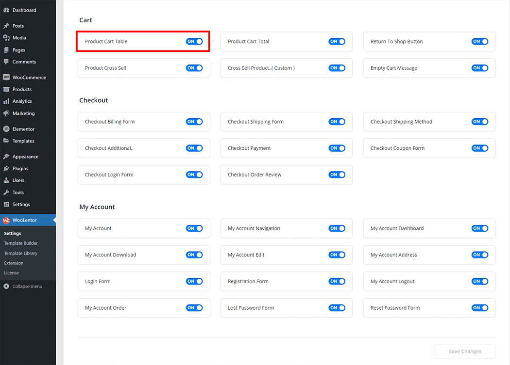 Go to WordPress Dashboard > WooLentor > Settings > Elements. From the list of Elements, turn ON the “Product Cart Table” widget.