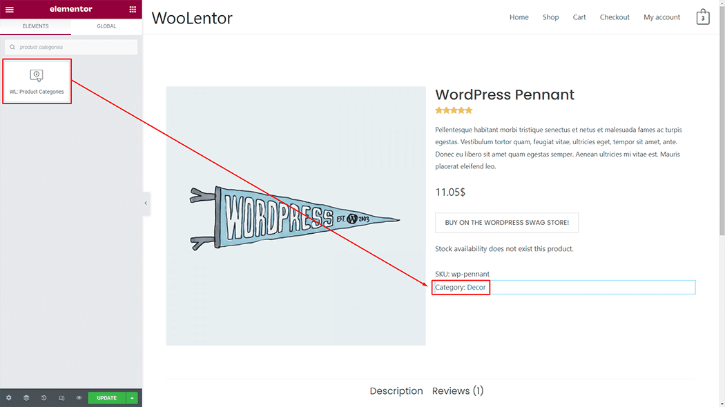 Drag and drop the WooLentor “Product Categories†widget onto the Single Page Template.