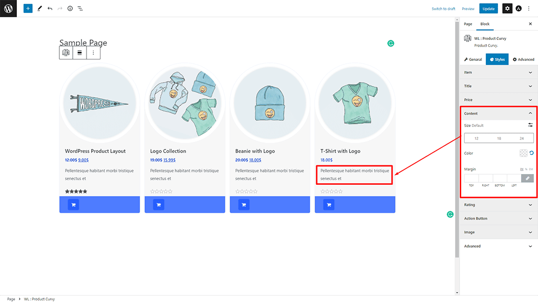Content: You can change the Size, Color, and Margin style of the Product Curvy as needed.