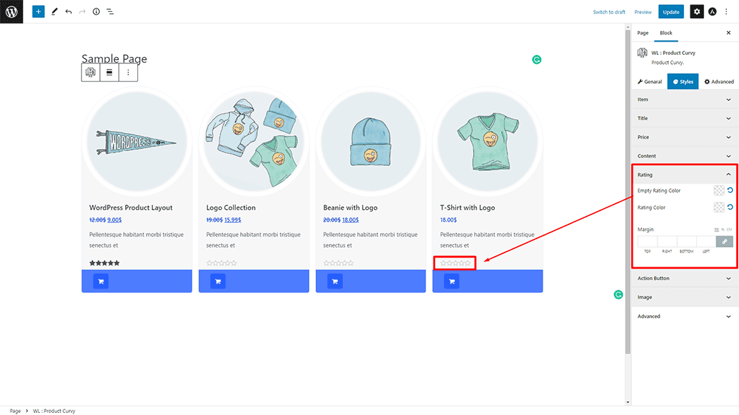 Rating: You can change the Empty Rating Color, Rating Color, and Margin style of the Product Curvy as needed.