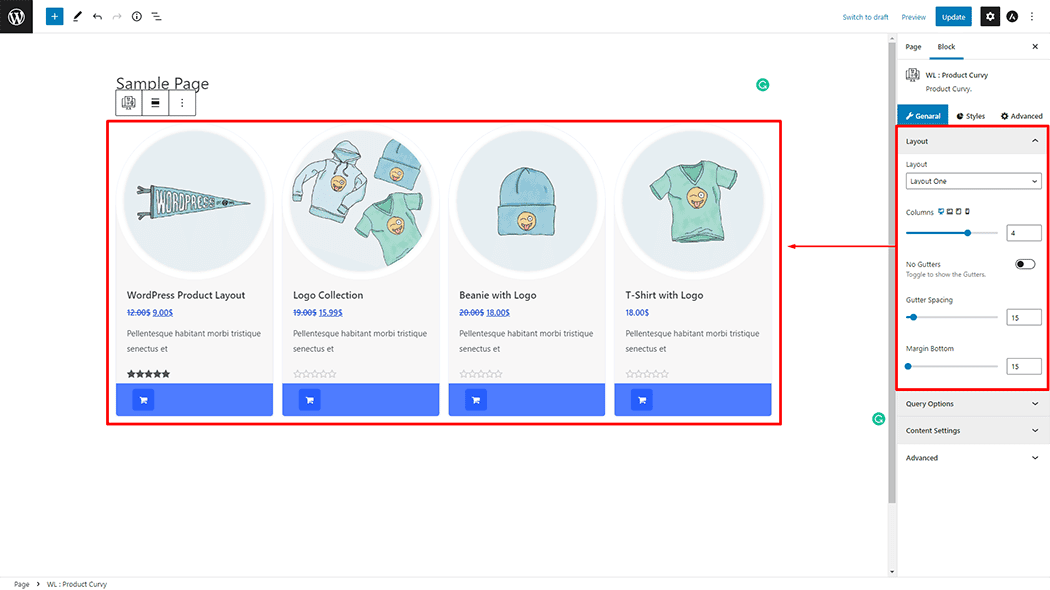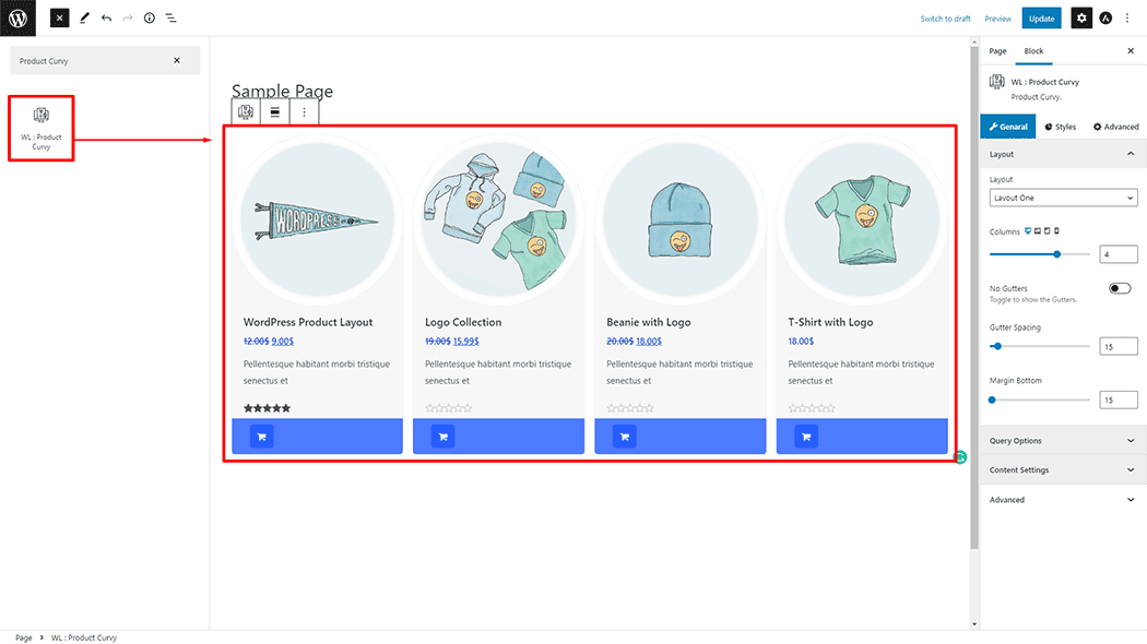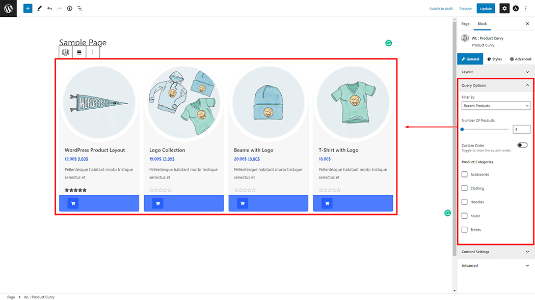 On the Page, the “Product Curvy†Block is used to view the Page Template on WooCommerce. The “Product Curvy†Block is mainly designed for the Page.