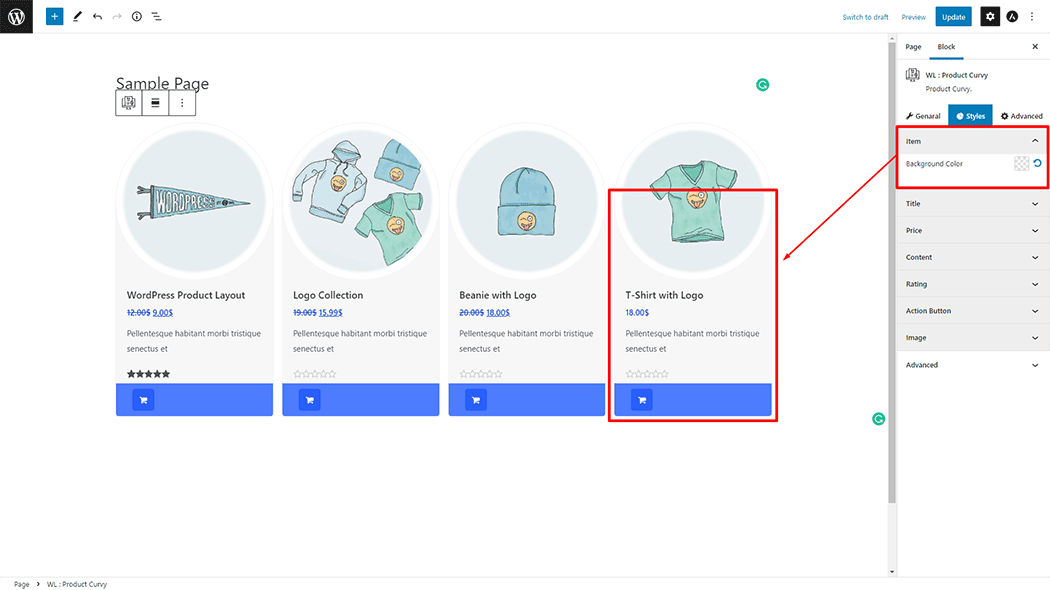 Item: You can change the Background Color style of the Product Curvy as needed.