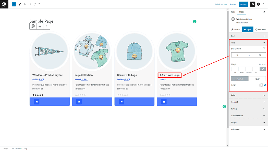 Title: You can change the Size, Margin, and Color style of the Product Curvy as needed.