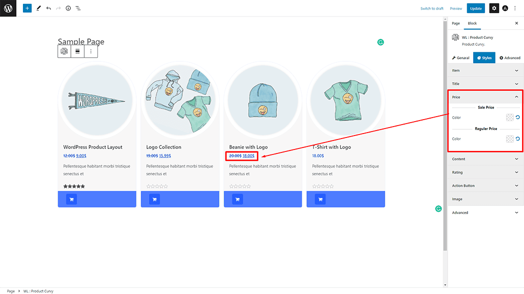 Action Button: You can change the Background Color, Color, Background Color, and Border Radius style of the Product Curvy as needed.