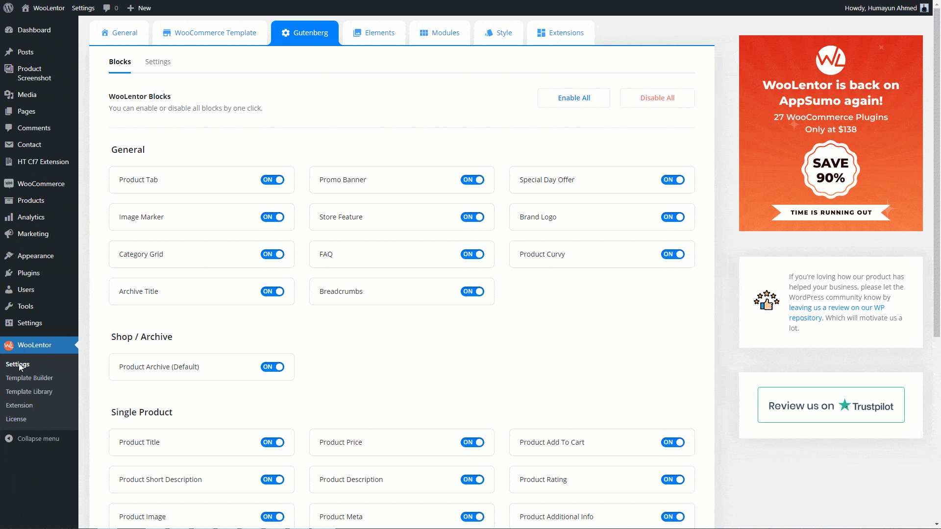 Go to Dashboard > WooLentor > Settings > Gutenberg. From the list of Gutenberg, turn ON the WL: Product Curvy Block.