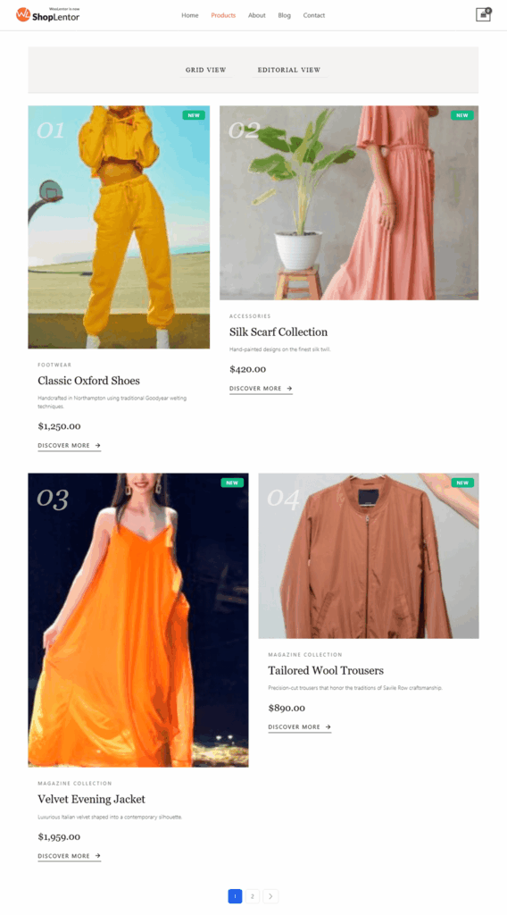 The Product Grid – Magazine Layout is a premium, editorial-style WooCommerce product display widget designed to give your shop a stylish and modern magazine-inspired look. With its asymmetric grid, large product numbering, alternating aspect ratios, and a refined editorial list layout, this widget is perfect for fashion, luxury, lifestyle, and boutique eCommerce stores.