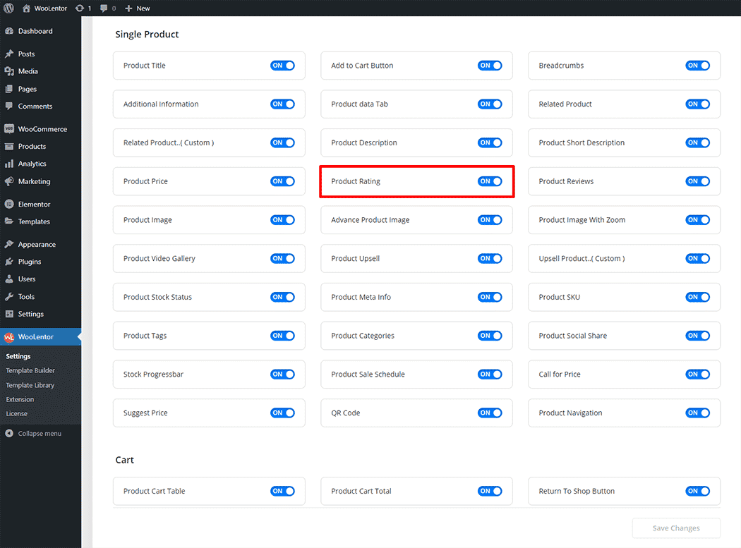 Go to WordPress Dashboard > WooLentor > Settings > Elements. From the list of Elements, turn ON the “Product Rating” widget.