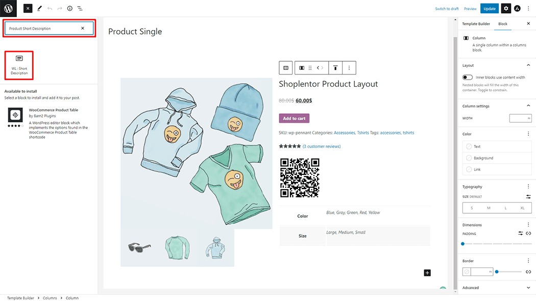 If you want to leverage the Product Short Description feature on your WooCommerce store, you will need to use a Block named “WL: Product Short Description“. To do so, simply search for the Block in the Gutenberg Block panel, and use it on the corresponding template that you have created for the Page.