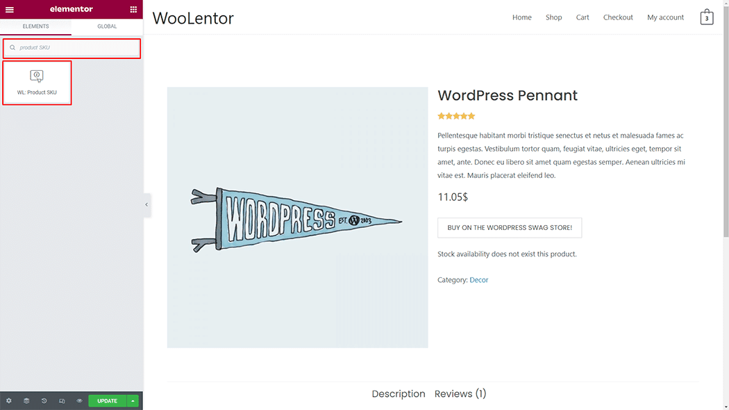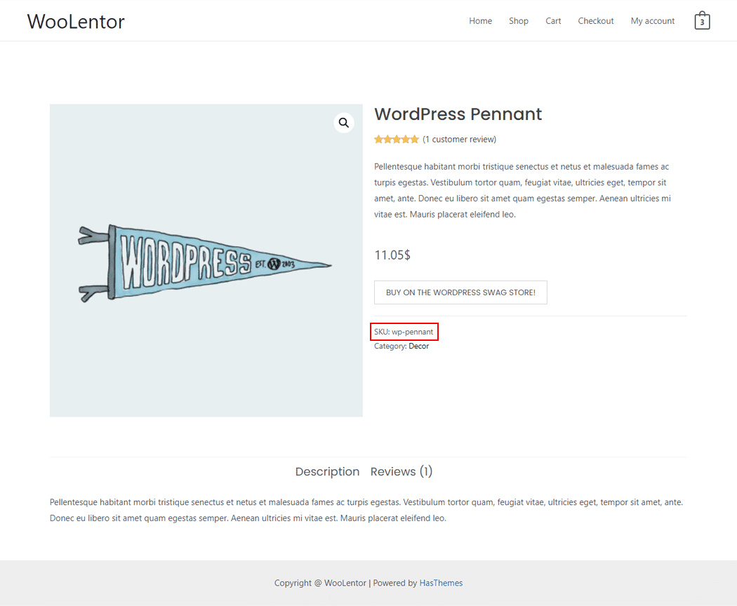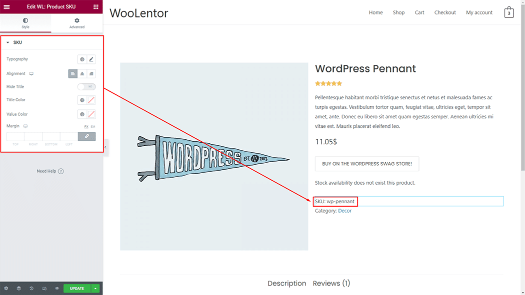 The “Product SKU” is a WooLentor widget that can be used to display the SKU of a WooCommerce product on the Single Product Template. In case you are wondering what an SKU is, it stands for “Stock Keeping Unit” which is actually a unique ID used for the purpose of tracking a product from the inventory.