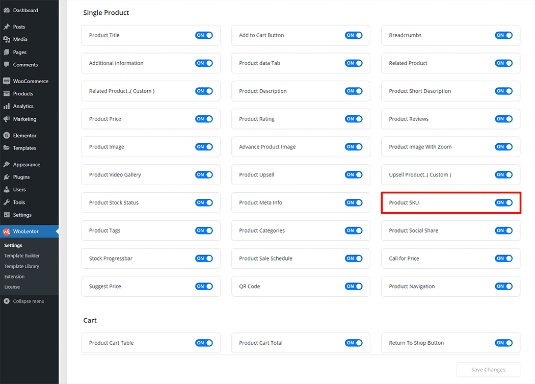 Go to WordPress Dashboard > WooLentor > Settings > Elements. From the list of Elements, turn ON the “Product SKU” widget.