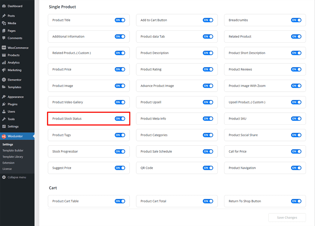 Go to WordPress Dashboard > WooLentor > Settings > Elements. From the list of Elements, turn ON the “Product Stock Status” widget.