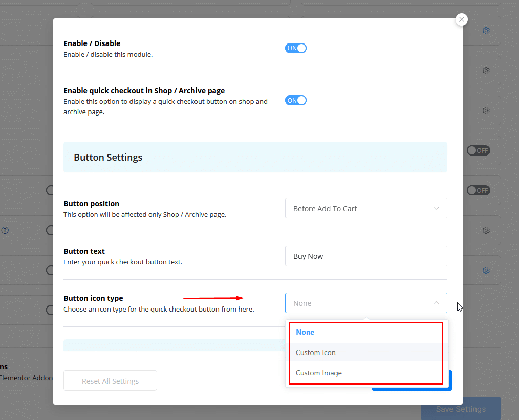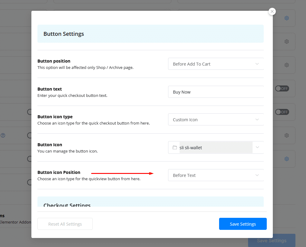 Customize the quick checkout button with various configuration options. These settings allow you to determine the button’s position, text, and icon.