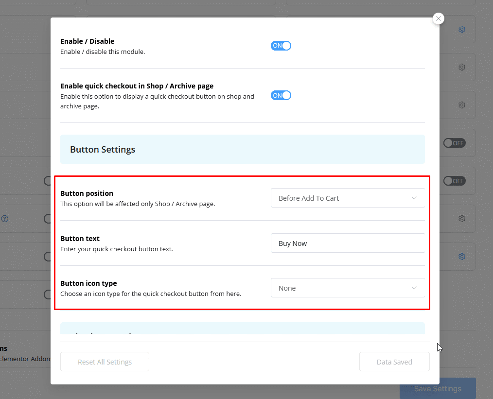 This option allows you to enable or disable the Quick Checkout Module for your WooCommerce site. To activate it: