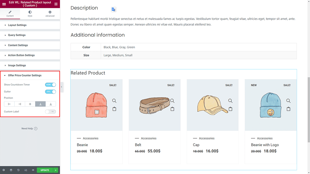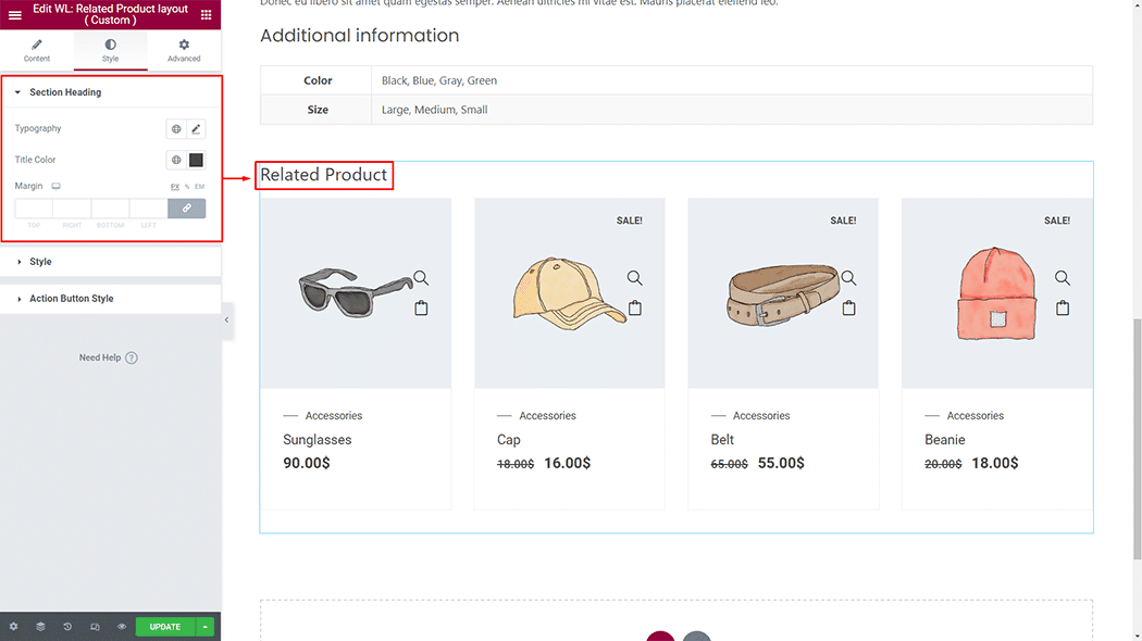 Section Heading: You can change the typography, text color, and margin style of the Related Product (Custom) as needed.