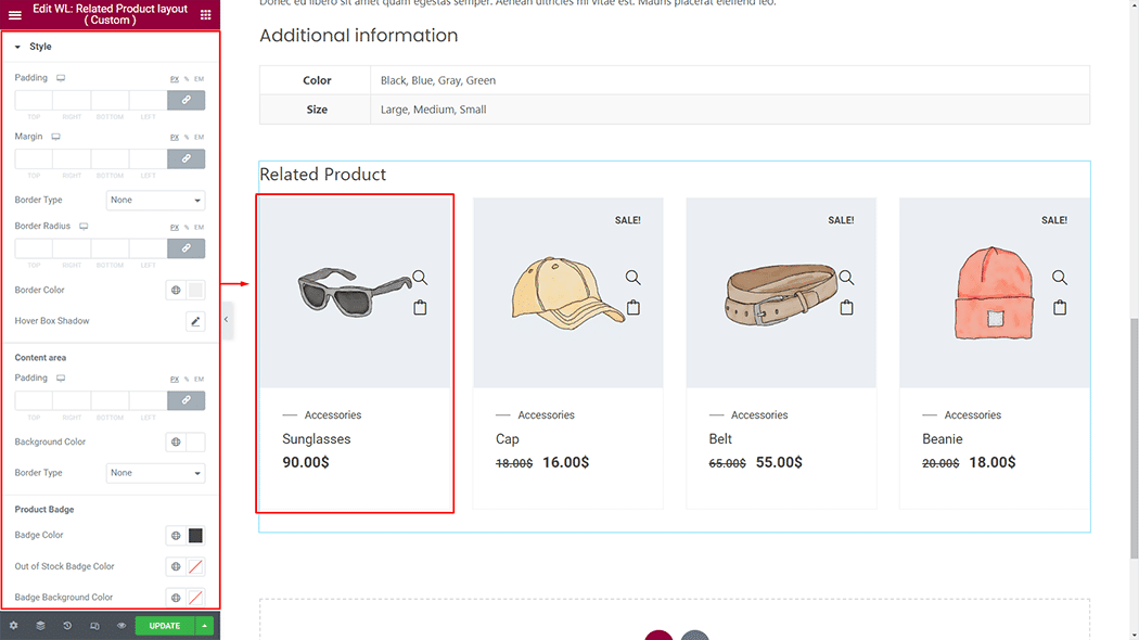 Style: You can change the Padding, Margin, Border Type, Border color, and hover Box Shadow style of the Related Product (Custom) as needed.