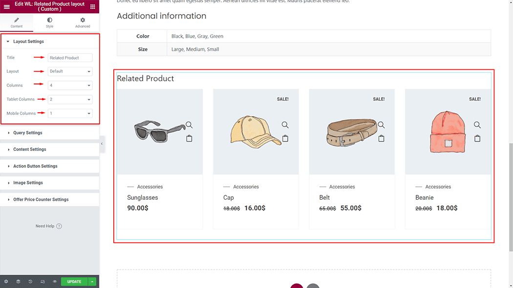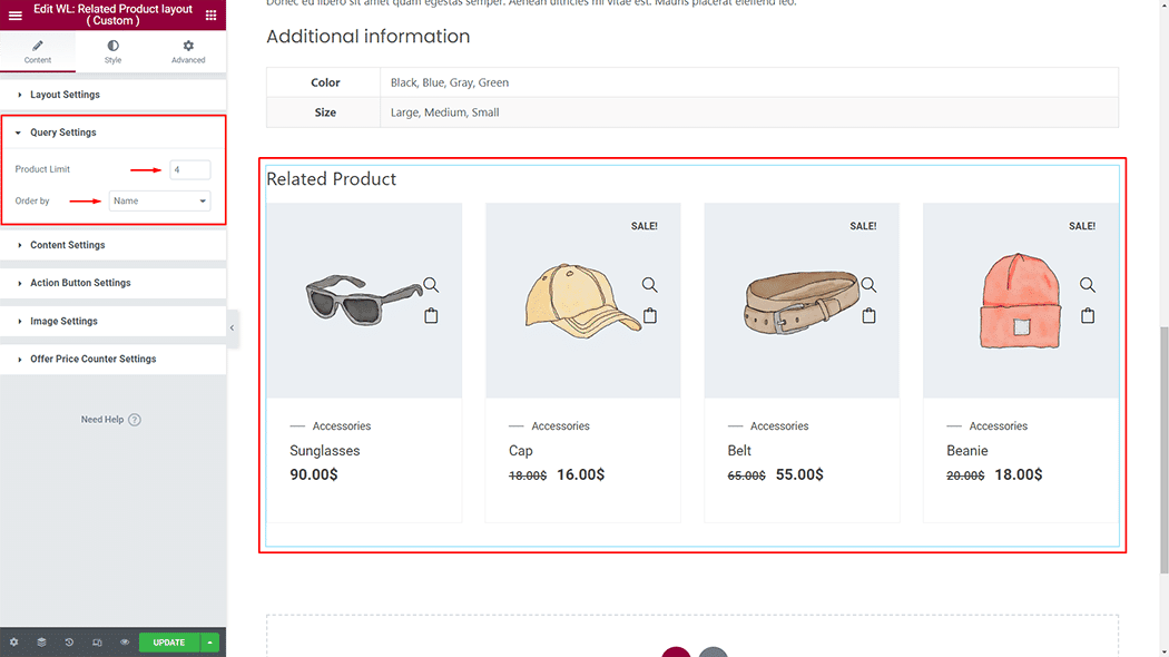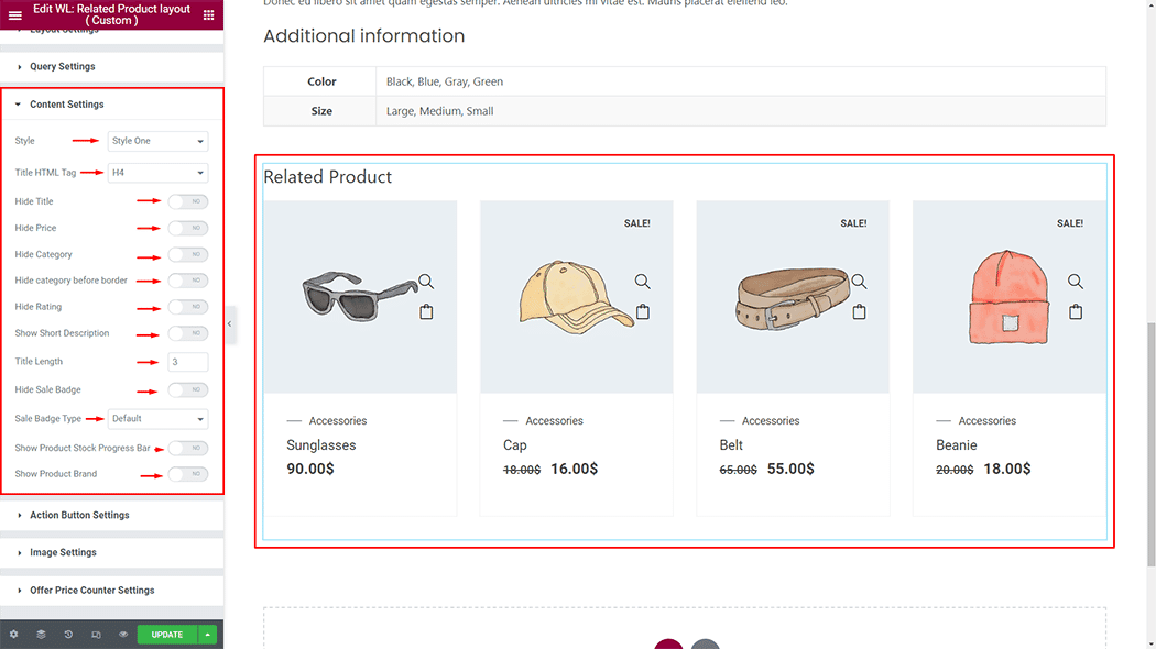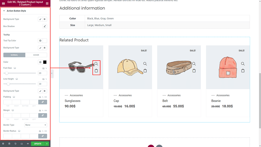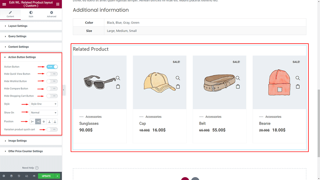 Action Button Style: You can set a custom style of the Related Product (Custom) as needed.
