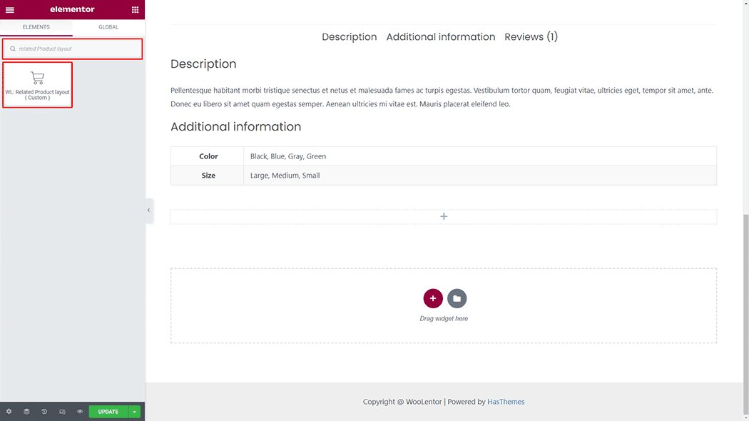 Drag and drop the WooLentor Related Product (Custom) widget onto the Single Product Template.