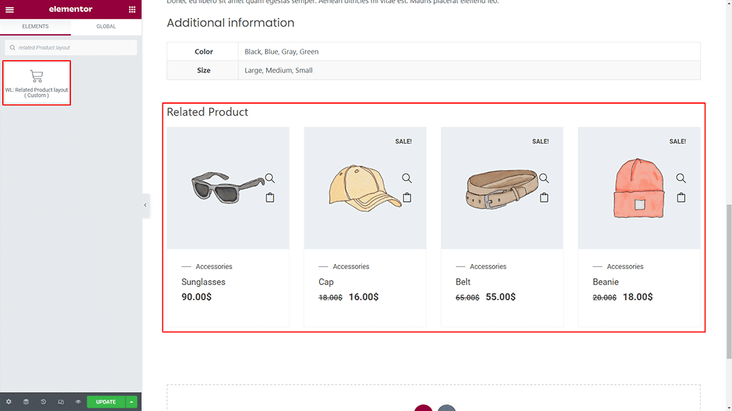 If you want to leverage the Related Product (Custom) on your WooCommerce store, you will need to use a widget named “WL: Related Product (Custom)“. To do so, simply search the widget in the Elementor widget panel, and use it on the corresponding template that you have created for the Single Product Template.