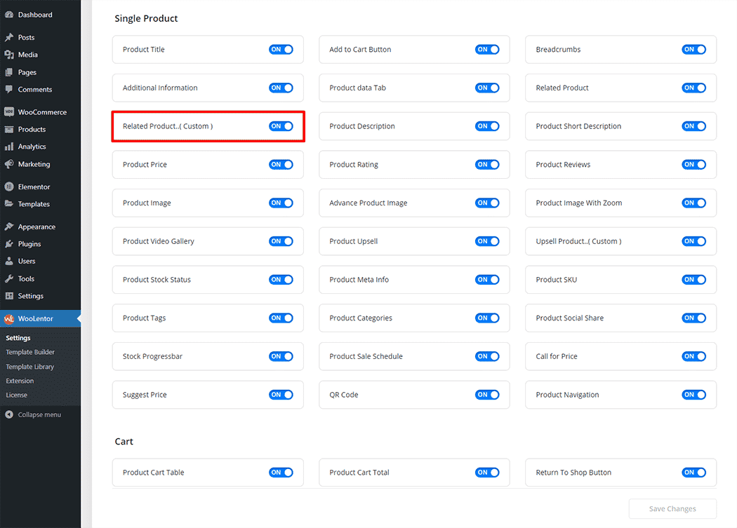 Go to WordPress Dashboard > WooLentor > Settings > Elements. From the list of Elements, turn ON the “Related Product (Custom)” widget.