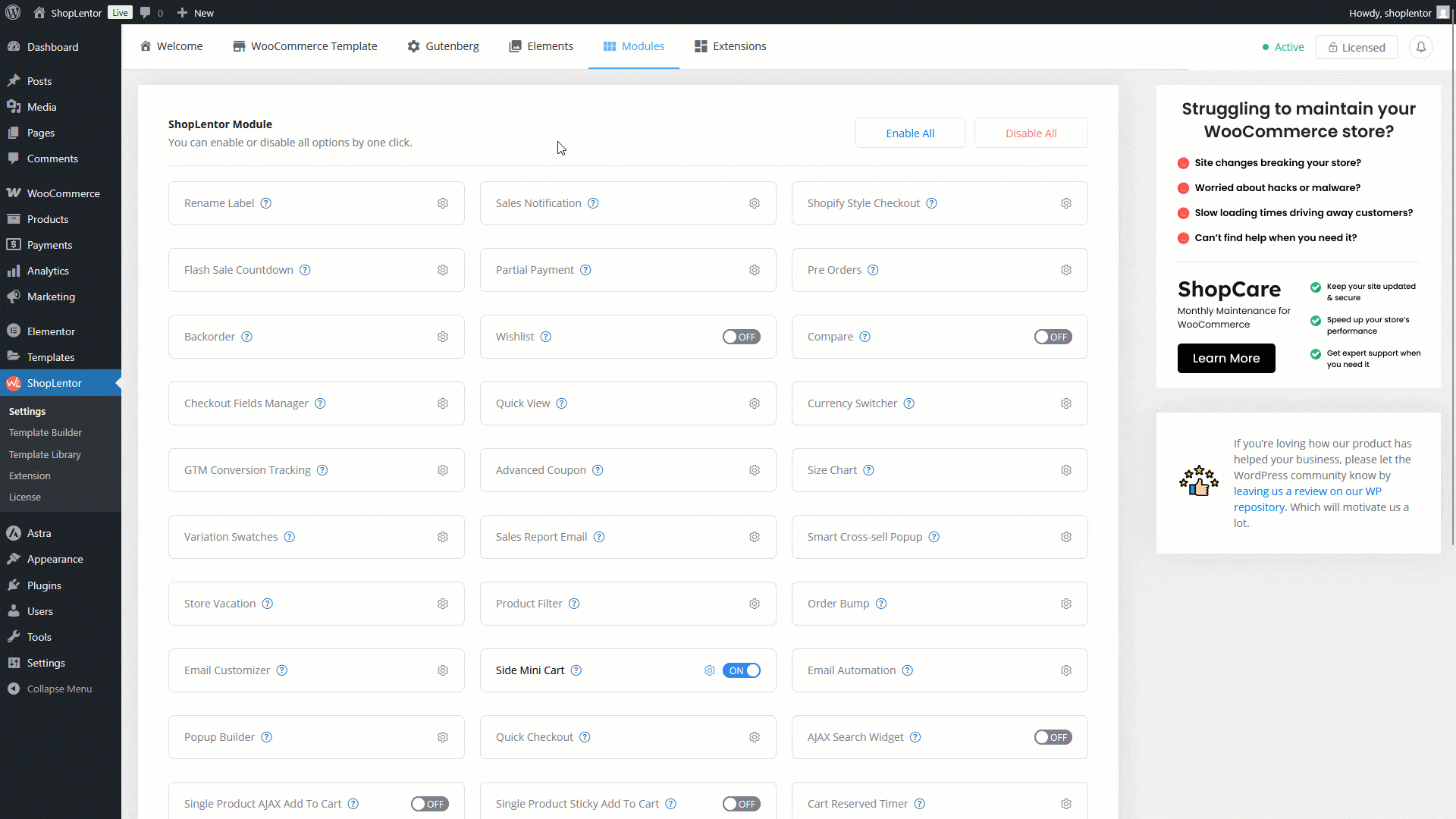 WordPress dashboard > WooLentor > Settings > Modules > Side Mini Cart