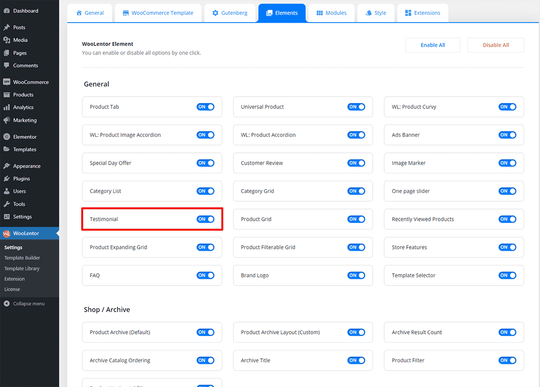 Go to Dashboard > WooLentor > Settings > Elements. From the list of Elements, turn ON the Testimonial widget.