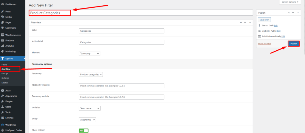 To add a new product filter item using UpFilter, access the UpFilter menu in your WordPress dashboard and click on the “Add New” submenu. Provide a unique name for the item and set the filtering criteria and taxonomy to determine its functionality and product display. Once you have configured the details, click “Publish” to make the product filter item live on your WooCommerce store, enhancing the overall filtering experience for your customers.