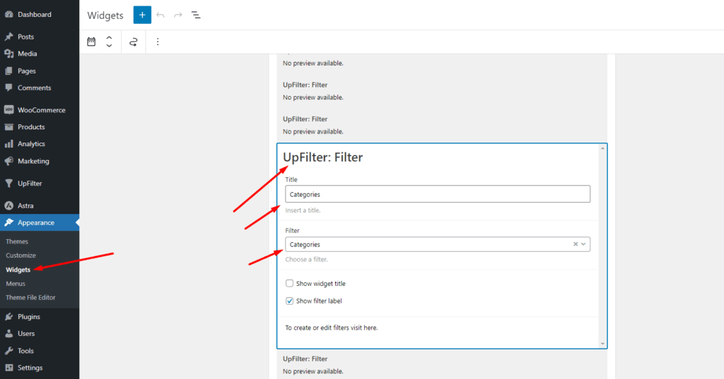 Select the filter created in the Filters section by selecting the “UpFilter: Filters” widget within the WooCommerce sidebar widget.