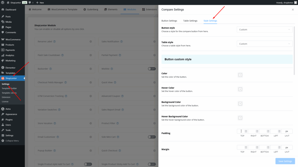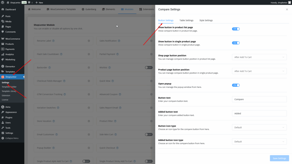 WordPress dashboard > WooLentor > Settings > Modules > Compare