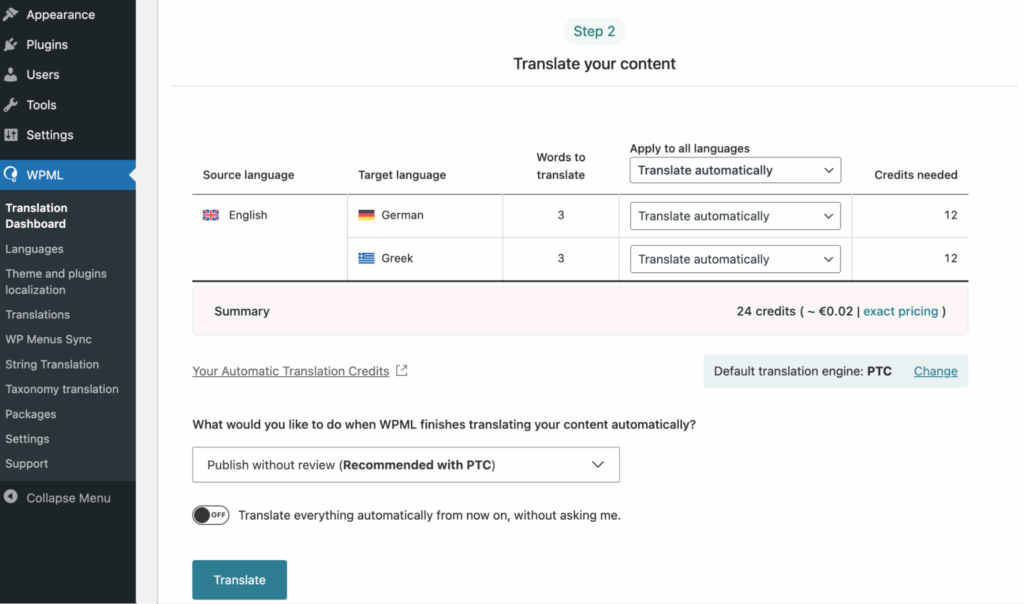 3. At Step 2, choose your translation method. With automatic translation, you can instantly translate as many strings you want. WPML recommends their own proprietary AI, Private Translation Cloud (PTC), for the most accurate results.